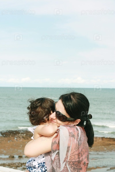 Мать обнимает своего ребенка на фоне моря