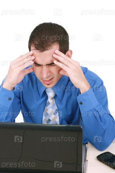 Бизнесмен с головной болью на рабочем месте на белом фоне