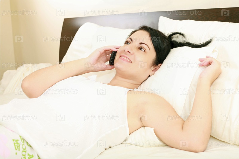 Счастливая молодая женщина в постели разговаривает по сотовому телефону