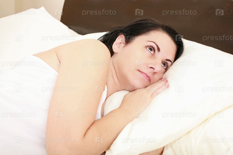 Молодая женщина лежит в кровати и думает о чем-то