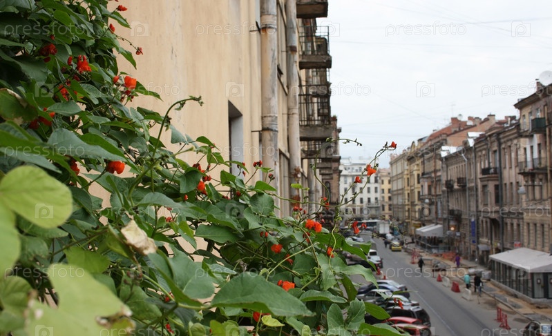 Фасоль огненно-красная или турецкие бобы на балконе с видом на улицу Рубинштейна в Санкт-Петербурге