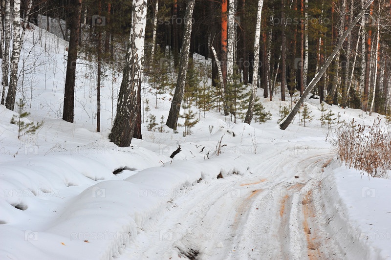 Зимний лес с березами, соснами и кустарником