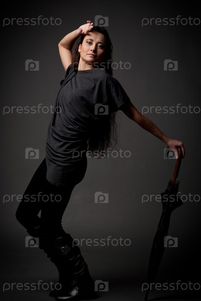 Красивая женщина стоит с зонтом на сером фоне