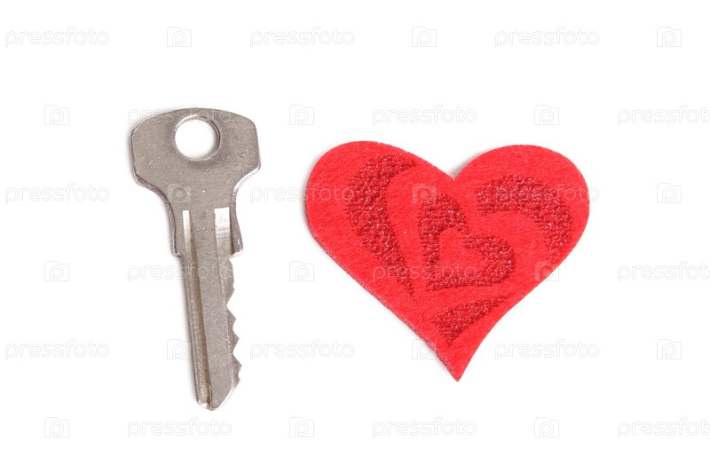Красное сердце и ключ на белом фоне