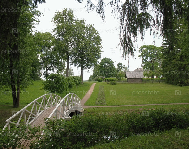 Горбатый деревянный мостик в парке усадьбы Михайловское. Музей-заповедник А.С.Пушкина
