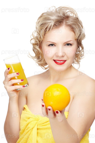 Красивая счастливая молодая блондинка со стаканом сока и апельсином