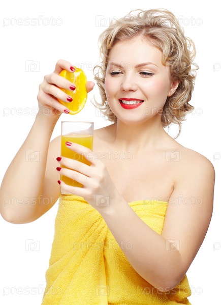 Женщина выжимает апельсин в стакан