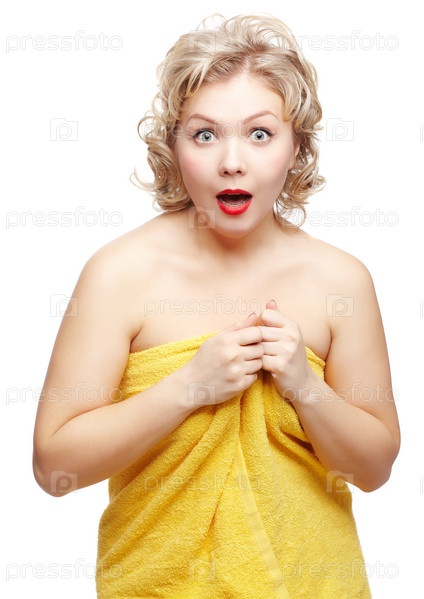 Испуганная красивая молодая блондинка в полотенце