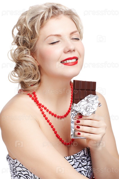 Красивая блондинка размера плюс наслаждается плиткой шоколада в фольге