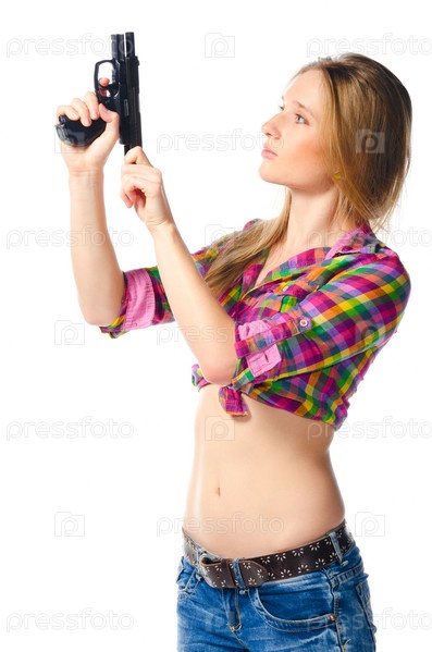 Красивая женщина с пистолетом на белом фоне