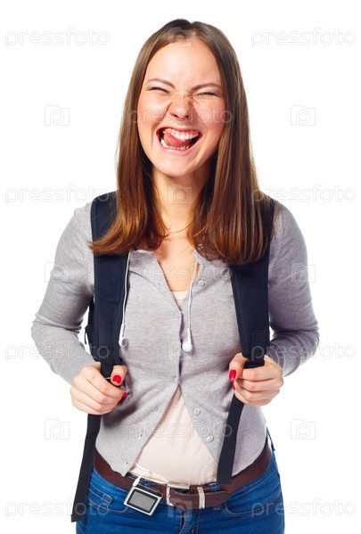 Веселая студентка на белом фоне