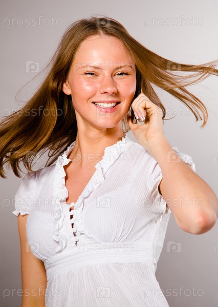 Счастливая девушка говорит по телефону на сером фоне