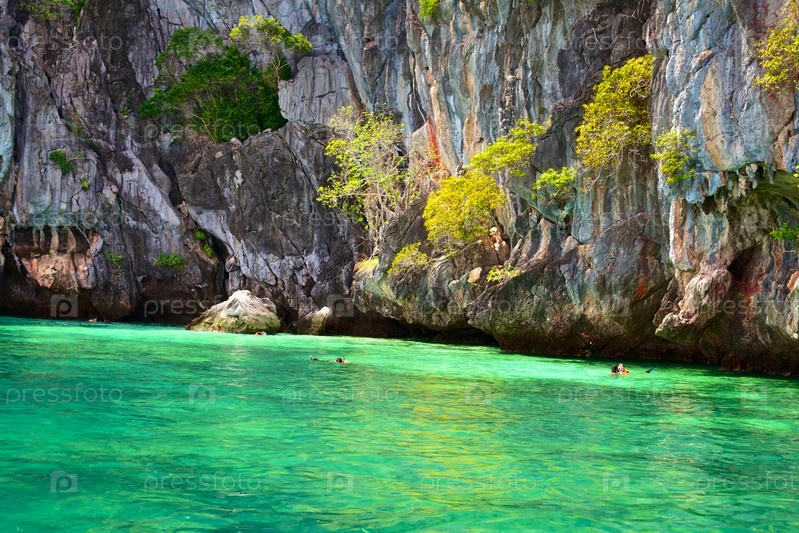 Люди занимаются подводным плаванием около пещеры Маракот в Андаманском море, Таиланд