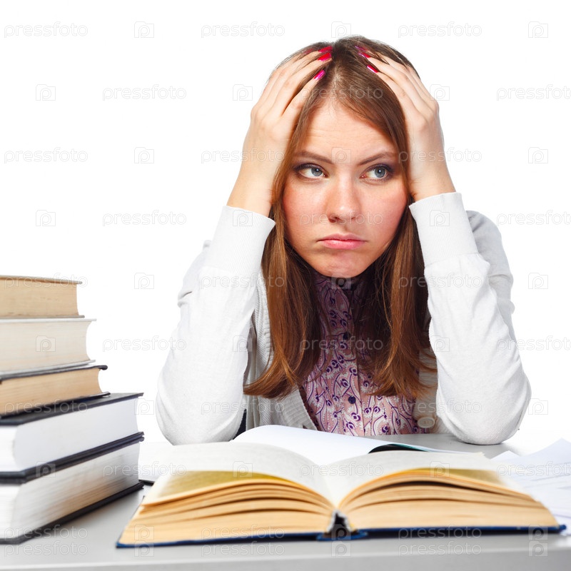 Усталая студентка над книгами на белом фоне