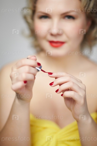 Красивая молодая блондинка размера плюс делает маникюр