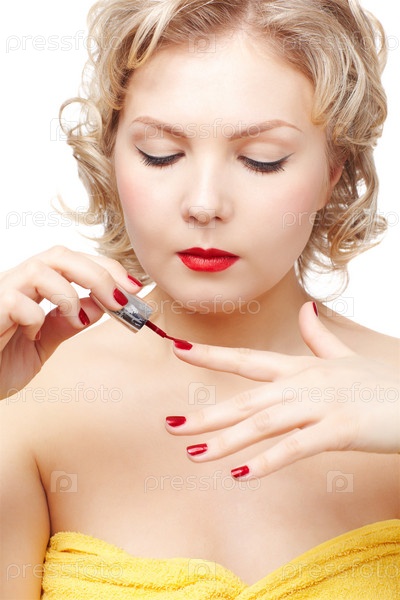 Красивая молодая блондинка размера плюс делает маникюр