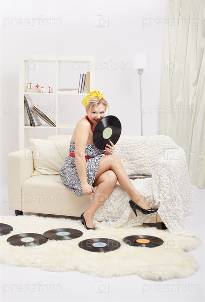 Красивая молодая блондинка сидит на диване, окруженная пластинками