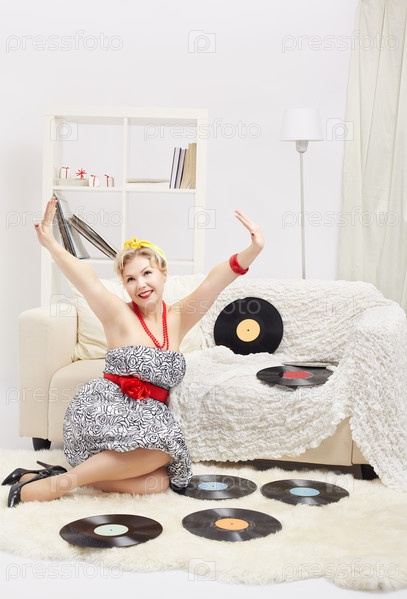 Красивая молодая блондинка с виниловыми пластинками