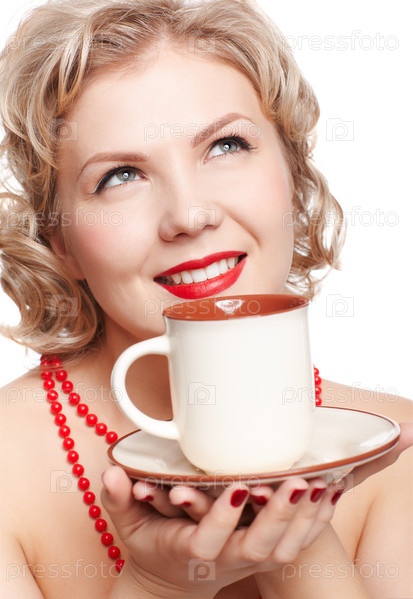 Красивая улыбающаяся молодая блондинка размера плюс с чашкой горячего напитка