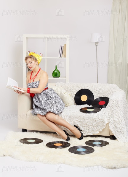 Красивая молодая блондинка, одетая в стиле 50-х годов, читает книгу, окруженная виниловыми пластинками