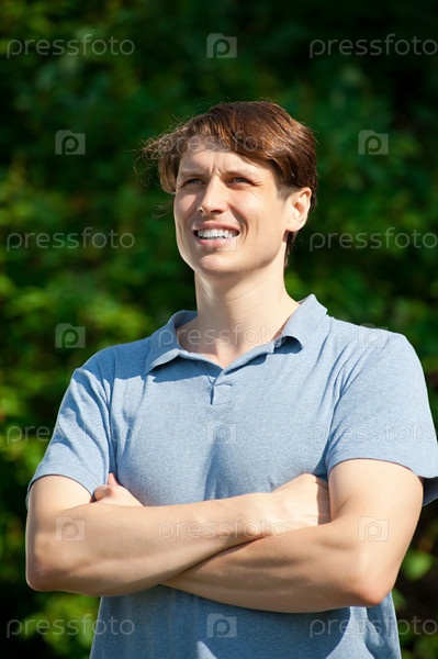 Мускулистый молодой человек со скрещенными на груди руками стоит в парке