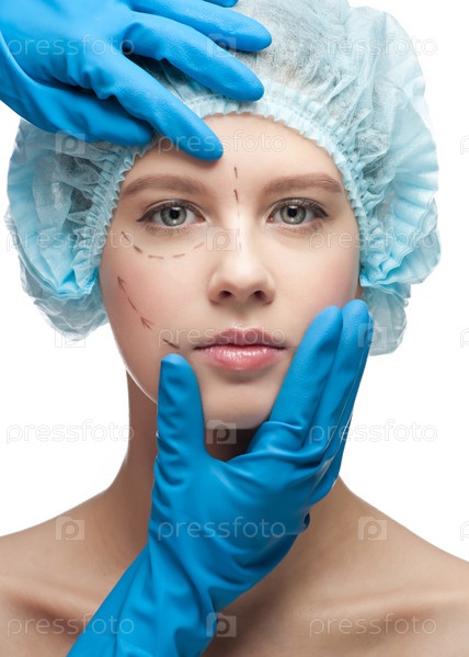 Красивая молодая женщина с пунктирными линиями на лице перед пластической операцией. Руки хирурга касаются лица