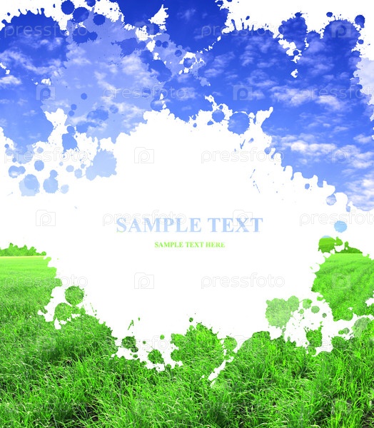 Фон с пятнами краски, облаками и зеленой травой