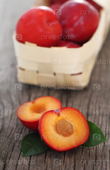 Свежие красные сливы на деревянном фоне