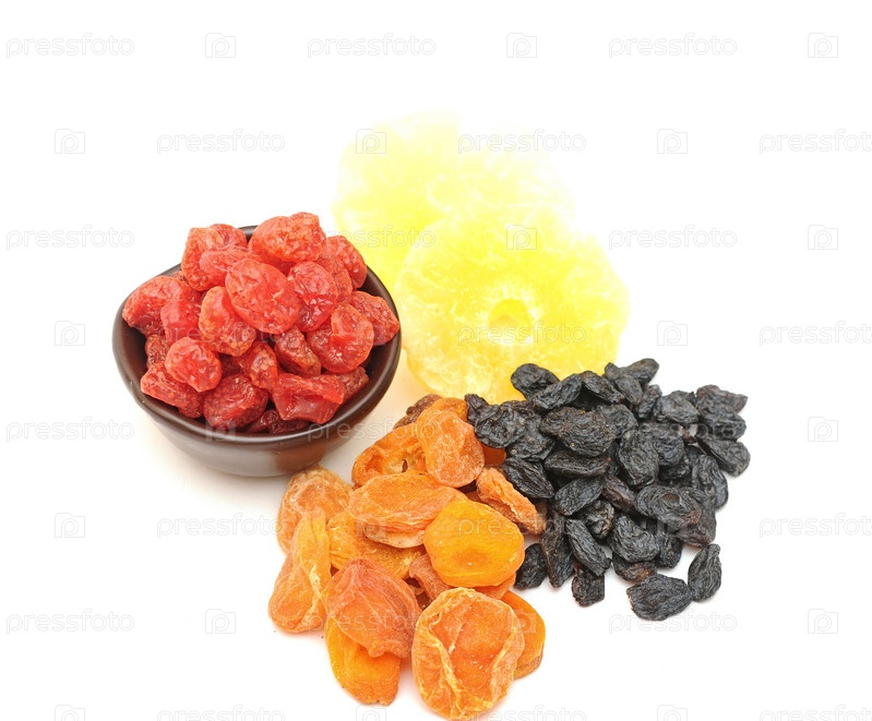 Сухофрукты: абрикосы, вишня, ананас и изюм на белом фоне