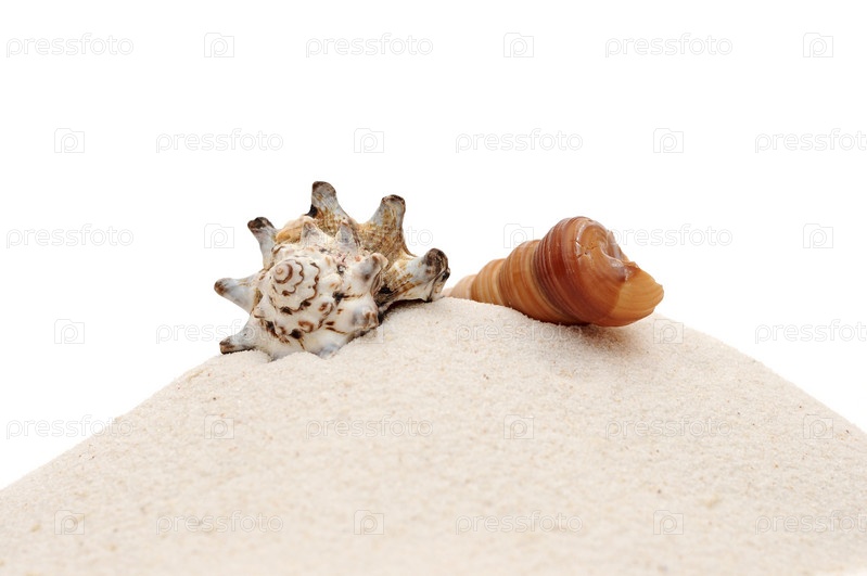 Красивые морские раковины на песке на белом фоне