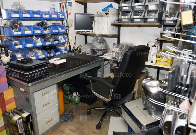 Загроможденный и неопрятный рабочий стол в мастерской по ремонту компьютеров