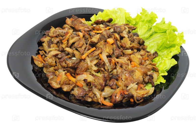 Жареные грибы (боровик) с морковью и луком на черной тарелке