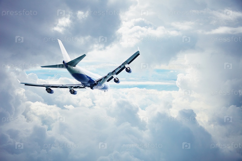 Самолет летит через густые облака