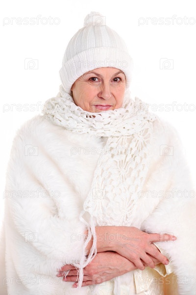 Симпатичная пожилая женщина в зимней одежде на белом фоне