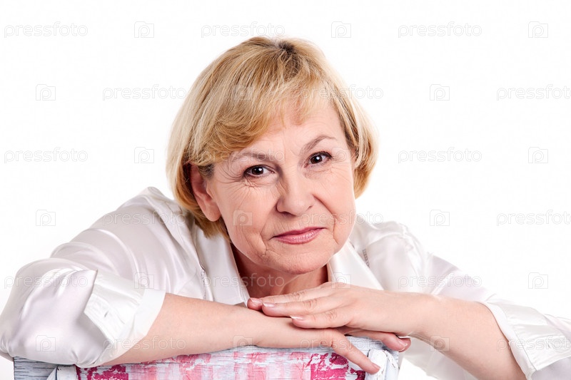 Веселая зрелая женщина на белом фоне