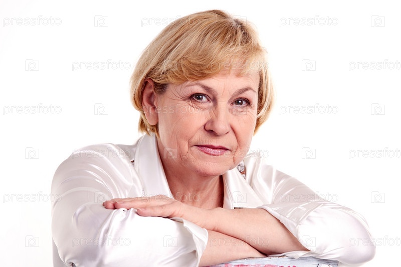Веселая зрелая женщина на белом фоне