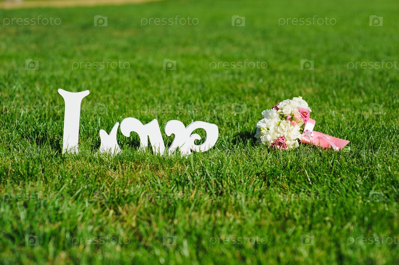 Знак любви и свадебный букет на зеленой лужайке