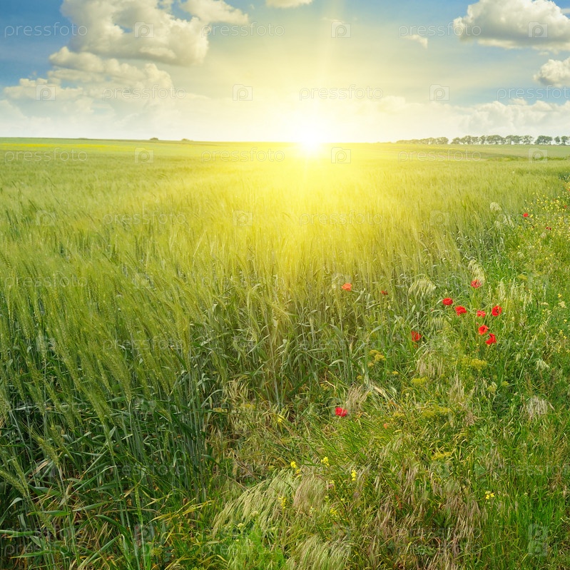 Поле, восход и голубое небо