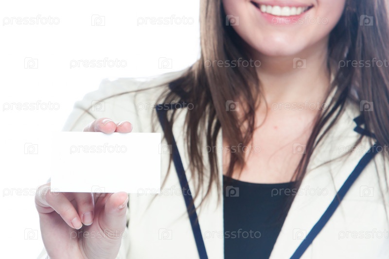 Портрет молодой красивой девушки с пустой визитной карточкой в руке