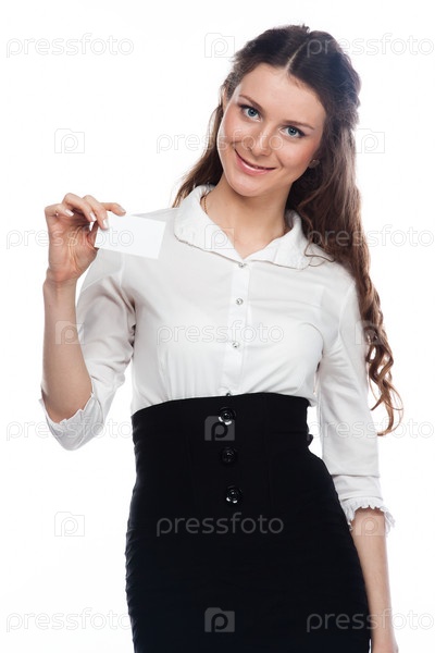 Портрет молодой красивой девушки с пустой визитной карточкой в руке