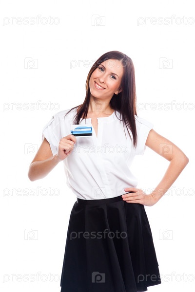 Портрет молодой красивой девушки с кредитной картой в руке