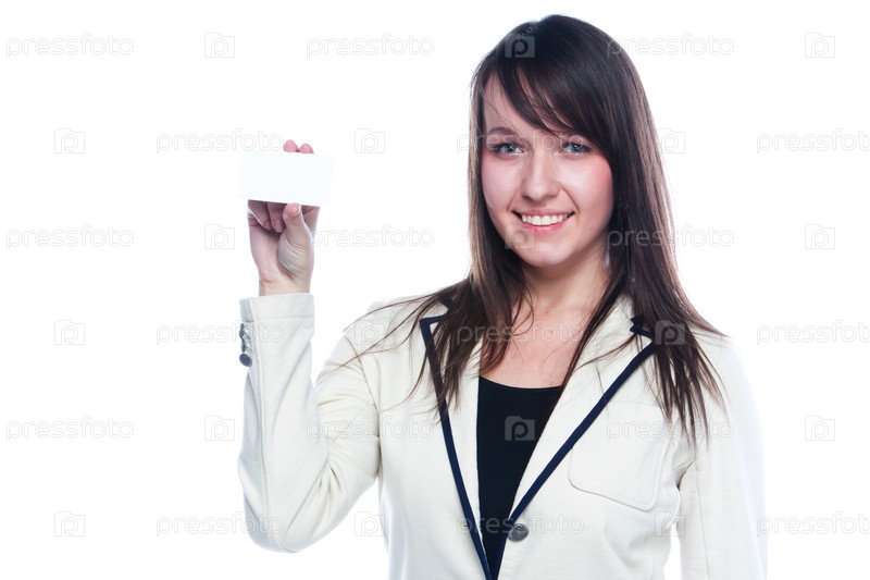 Портрет молодой красивой девушки с чистой визитной карточкой в руке
