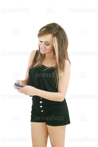 Девушка отправляет текстовое сообщение со своего мобильного телефона, изолированная на белом фоне