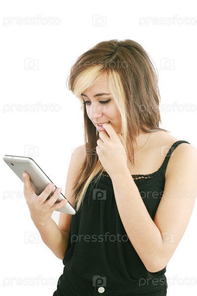 Женщина Холдинг новых электронных сенсорных устройств Девушка с задумчивым взглядом смотрит на планшетный компьютер, изолированный на белом фоне
