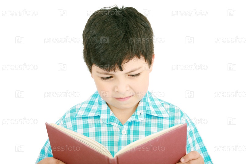 Маленький мальчик читает книгу на белом фоне