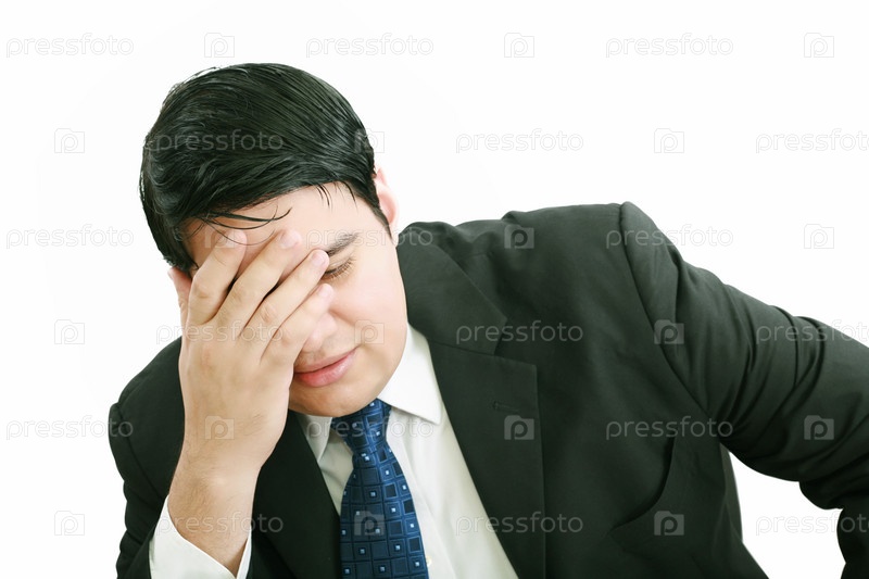 Деловой человек в депрессии от работы на белом фоне