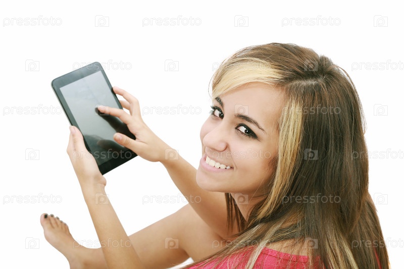 Красивая девушка сидит на полу с планшетным компьютером и улыбается
