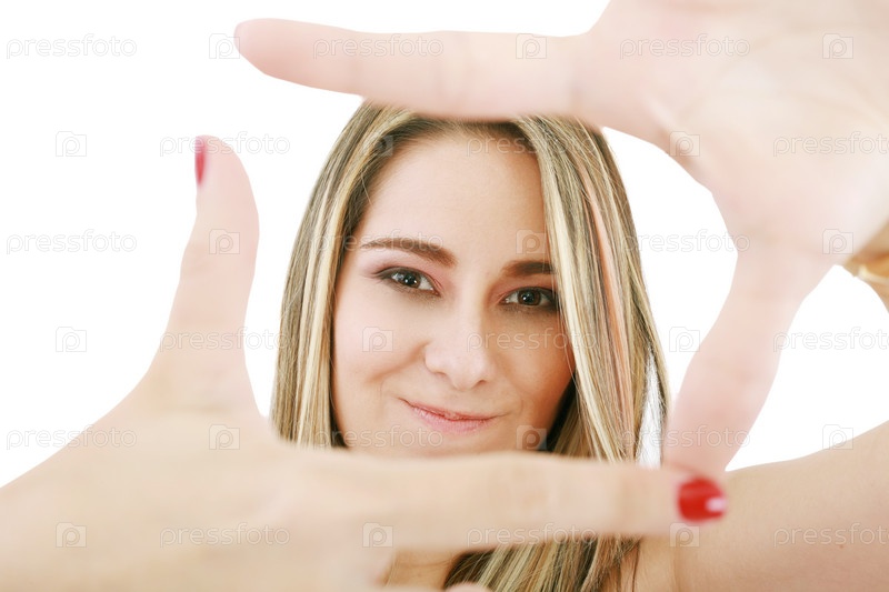 Молодая привлекательная женщина держит руки в форме рамки
