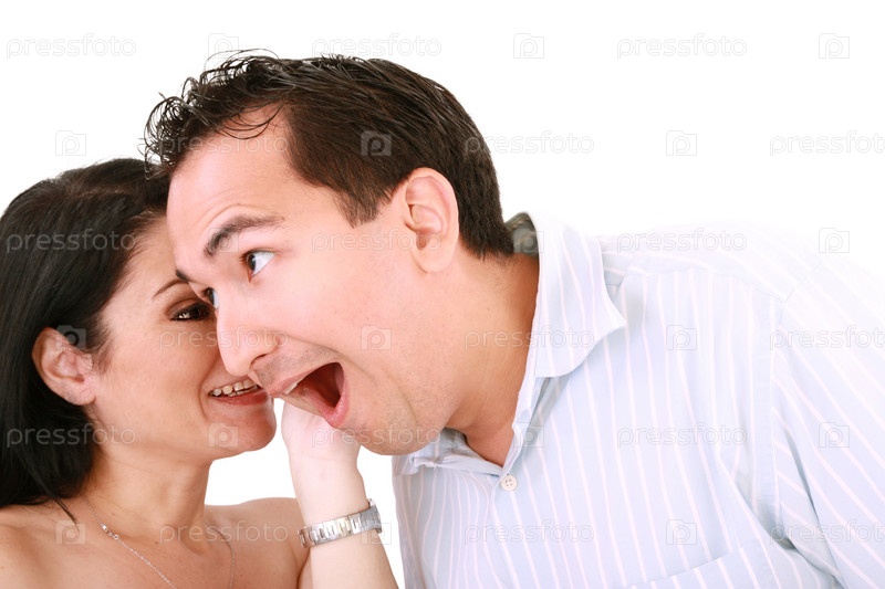 Девушка шепчет что-то на ухо удивленному мужчине. Иоляция на белом фоне