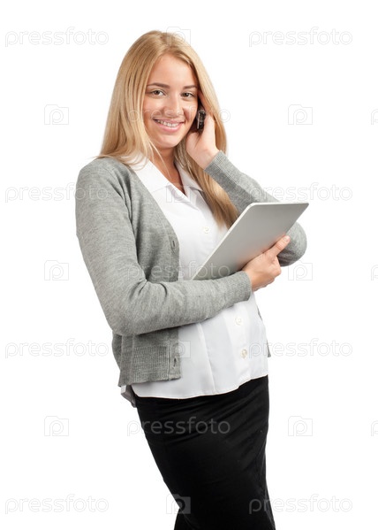 Привлекательная бизнес-леди с планшетным компьютером говорит по мобильному телефону